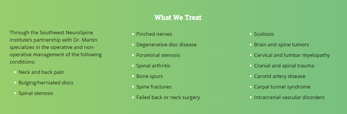 Dr. Martin manages a range of conditions with both operative and non-operative techniques, including debilitating pain of the back and neck.